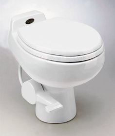 The Sealand 510+ ceramic Low Flush Toilet flushes with as little as one pint of water! Water can be added via a connection to a pressurized water supply (20-40 PSI), a gravity feed, or it can be manually added. Great for use in RVs, cotatges, cabins, boats and more. Size: 20 1/2" L x 15 1/4" W x 18 3/4" H (17 1/8" H to toilet seat). White color.